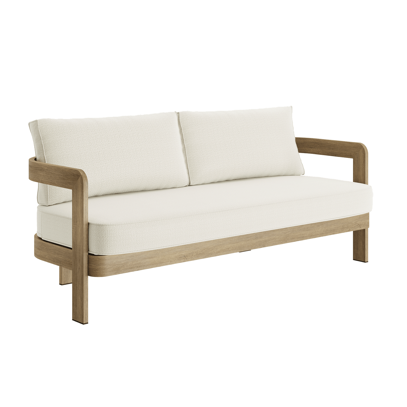 The N3 collection pays homage to the modern concept of proportion and architectural intricacy. The N3 Sofa is meticulously constructed from robust aluminium with a realistic wood effect powder coated finish. Its clean lines are juxtaposed with its gracefully curved backrest, accompanied by two supporting side legs and and two subtle legs at the rear.